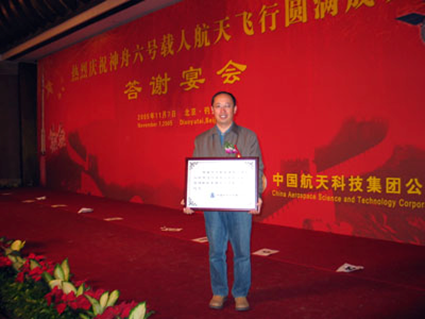 2005年,中國(guó)航天科技集團(tuán)為感謝銀利電器為我國(guó)神舟六號(hào)載人航天飛行任務(wù)飛船和運(yùn)載火箭研制配套中作出的貢獻(xiàn),邀請(qǐng)公司董事長(zhǎng)焦海波先生參加慶?!吧裰哿?hào)載人航天飛船飛行圓滿成功”答謝宴會(huì),并頒發(fā)榮譽(yù)證書。